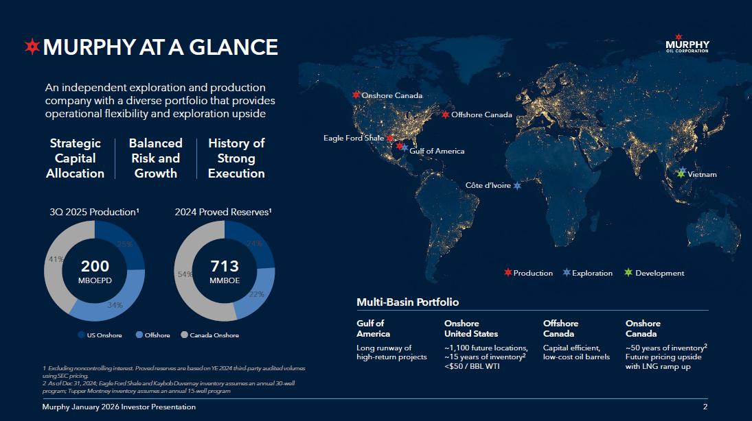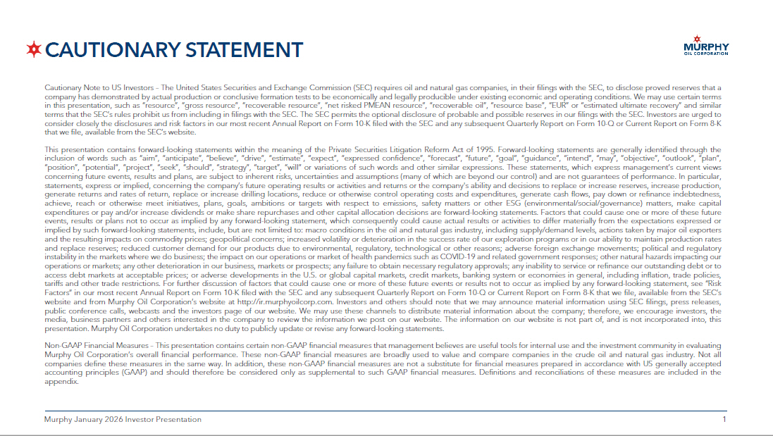 1 1 Murphy January 2026 Investor Presentation CAUTIONARY STATEMENT Cautionary Note to US Investors – The United States Securities and Exchange Commission (SEC) requires oil and natural gas companies, in their filings with the SEC, to disclose proved reserves that a company has demonstrated by actual production or conclusive formation tests to be economically and legally producible under existing economic and operating conditions . We may use certain terms in this presentation, such as “resource”, “gross resource”, “recoverable resource”, “net risked PMEAN resource”, “recoverable oil”, “resource base”, “EUR” or “estimated ultimate recovery” and similar terms that the SEC’s rules prohibit us from including in filings with the SEC . The SEC permits the optional disclosure of probable and possible reserves in our filings with the SEC . Investors are urged to consider closely the disclosures and risk factors in our most recent Annual Report on Form 10 - K filed with the SEC and any subsequent Quarterly Report on Form 10 - Q or Current Report on Form 8 - K that we file, available from the SEC’s website . This presentation contains forward - looking statements within the meaning of the Private Securities Litigation Reform Act of 1995 . Forward - looking statements are generally identified through the inclusion of words such as “aim”, “anticipate”, “believe”, “drive”, “estimate”, “expect”, “expressed confidence”, “forecast”, “future”, “goal”, “guidance”, “intend”, “may”, “objective”, “outlook”, “plan”, “position”, “potential”, “project”, “seek”, “should”, “strategy”, “target”, “will” or variations of such words and other similar expressions . These statements, which express management’s current views concerning future events, results and plans, are subject to inherent risks, uncertainties and assumptions (many of which are beyond our control) and are not guarantees of performance . In particular, statements, express or implied, concerning the company’s future operating results or activities and returns or the company's ability and decisions to replace or increase reserves, increase production, generate returns and rates of return, replace or increase drilling locations, reduce or otherwise control operating costs and expenditures, generate cash flows, pay down or refinance indebtedness, achieve, reach or otherwise meet initiatives, plans, goals, ambitions or targets with respect to emissions, safety matters or other ESG (environmental/social/governance) matters, make capital expenditures or pay and/or increase dividends or make share repurchases and other capital allocation decisions are forward - looking statements . Factors that could cause one or more of these future events, results or plans not to occur as implied by any forward - looking statement, which consequently could cause actual results or activities to differ materially from the expectations expressed or implied by such forward - looking statements, include, but are not limited to : macro conditions in the oil and natural gas industry, including supply/demand levels, actions taken by major oil exporters and the resulting impacts on commodity prices ; geopolitical concerns ; increased volatility or deterioration in the success rate of our exploration programs or in our ability to maintain production rates and replace reserves ; reduced customer demand for our products due to environmental, regulatory, technological or other reasons ; adverse foreign exchange movements ; political and regulatory instability in the markets where we do business ; the impact on our operations or market of health pandemics such as COVID - 19 and related government responses ; other natural hazards impacting our operations or markets ; any other deterioration in our business, markets or prospects ; any failure to obtain necessary regulatory approvals ; any inability to service or refinance our outstanding debt or to access debt markets at acceptable prices ; or adverse developments in the U . S . or global capital markets, credit markets, banking system or economies in general, including inflation, trade policies, tariffs and other trade restrictions . For further discussion of factors that could cause one or more of these future events or results not to occur as implied by any forward - looking statement, see “Risk Factors” in our most recent Annual Report on Form 10 - K filed with the SEC and any subsequent Quarterly Report on Form 10 - Q or Current Report on Form 8 - K that we file, available from the SEC’s website and from Murphy Oil Corporation’s website at http : //ir . murphyoilcorp . com . Investors and others should note that we may announce material information using SEC filings, press releases, public conference calls, webcasts and the investors page of our website . We may use these channels to distribute material information about the company ; therefore, we encourage investors, the media, business partners and others interested in the company to review the information we post on our website . The information on our website is not part of, and is not incorporated into, this presentation . Murphy Oil Corporation undertakes no duty to publicly update or revise any forward - looking statements . Non - GAAP Financial Measures – This presentation contains certain non - GAAP financial measures that management believes are useful tools for internal use and the investment community in evaluating Murphy Oil Corporation’s overall financial performance . These non - GAAP financial measures are broadly used to value and compare companies in the crude oil and natural gas industry . Not all companies define these measures in the same way . In addition, these non - GAAP financial measures are not a substitute for financial measures prepared in accordance with US generally accepted accounting principles (GAAP) a