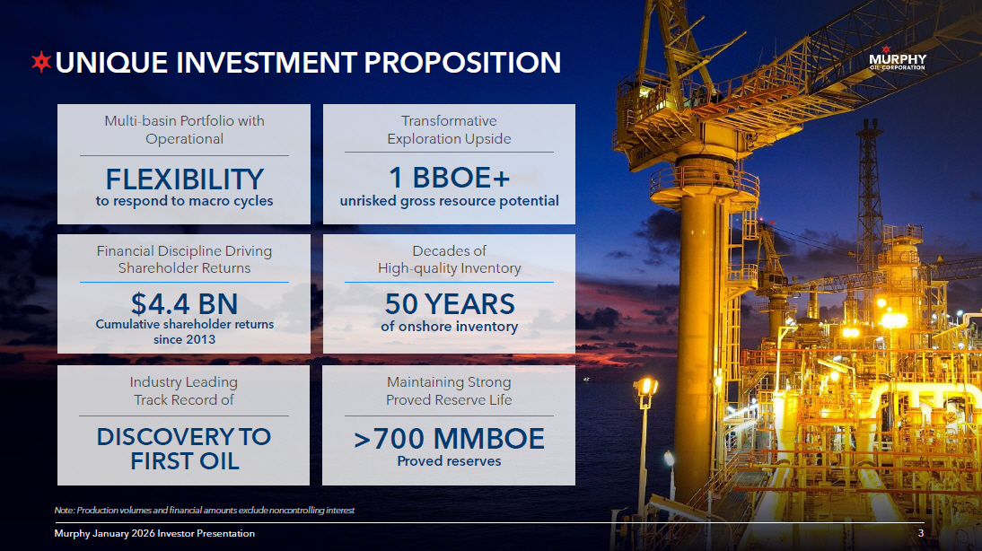 2 2 Murphy January 2026 Investor Presentation Eagle Ford Shale Gulf of America Offshore Canada Production Exploration Development Onshore Canada Côte d’Ivoire Vietnam MURPHY AT A GLANCE 2 Murphy January 2026 Investor Presentation An independent exploration and production company with a diverse portfolio that provides operational flexibility and exploration upside 1 Excluding noncontrolling interest. Proved reserves are based on YE 2024 third - party audited volumes using SEC pricing. 2 As of Dec 31, 2024; Eagle Ford Shale and Kaybob Duvernay inventory assumes an annual 30 - well program; Tupper Montney inventory assumes an annual 15 - well program Strategic Capital Allocation Balanced Risk and Growth History of Strong Execution Multi - Basin Portfolio Gulf of America Long runway of high - return projects Onshore United States ~1,100 future locations, ~15 years of inventory 2 <$50 / BBL WTI Offshore Canada Capital efficient, low - cost oil barrels Onshore Canada ~50 years of inventory 2 Future pricing upside with LNG ramp up 25% 34% 41% 3Q 2025 Production 1 24% 22% 54% 2024 Proved Reserves 1 US Onshore Offshore Canada Onshore 200 MBOEPD 713 MMBOE