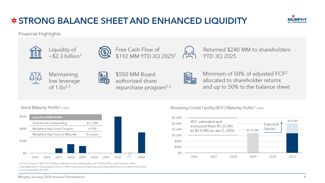 3 3 Murphy January 2026 Investor Presentation UNIQUE INVESTMENT PROPOSITION 3 Multi - basin Portfolio with Operational Financial Discipline Driving Shareholder Returns Industry Leading Track Record of Transformative Exploration Upside Decades of High - quality Inventory Maintaining Strong Proved Reserve Life Murphy January 2026 Investor Presentation Note: Production volumes and financial amounts exclude noncontrolling interest DISCOVERY TO FIRST OIL >700 MMBOE Proved reserves $4.4 BN Cumulative shareholder returns since 2013 FLEXIBILITY to respond to macro cycles 50 YEARS of onshore inventory 1 BBOE+ unrisked gross resource potential