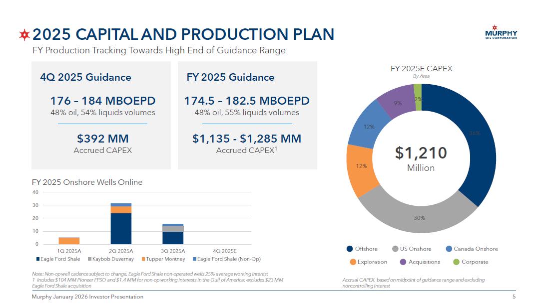 4 4 Murphy January 2026 Investor Presentation STRONG BALANCE SHEET AND ENHANCED LIQUIDITY Bond Maturity Profile 3 $ MM $0 $200 $400 $600 2025 2026 2027 2028 2029 2030 2031 2032 2042 Long - Term Debt Profile $1.3 BN Total Bonds Outstanding 6.10% Weighted Avg Fixed Coupon 8.6 years Weighted Avg Years to Maturity Financial Highlights 1 As of January 2, 2026. $1.9 billion undrawn on the credit facility and ~$350 million cash inclusive of NCI 2 See Appendix for reconciliation of non - GAAP measures and slide notes providing definitions and other information 3 As of September 30, 2025 Revolving Credit Facility (RCF) Maturity Profile 1 $ MM Liquidity of ~$2.3 billion 1 Maintaining low leverage of 1.0x 2,3 Free Cash Flow of $192 MM YTD 3Q 2025 2 Returned $240 MM to shareholders YTD 3Q 2025 $550 MM Board authorized share repurchase program 2,3 Minimum of 50% of adjusted FCF 2 allocated to shareholder returns and up to 50% to the balance sheet $0 $400 $800 $1,200 $1,600 $2,000 $2,400 2026 2027 2028 2029 2030 2031 Extend & Upsize $2.0 BN $1.35 BN RCF extended and increased from $1.35 BN to $2.0 BN on Jan 2, 2026