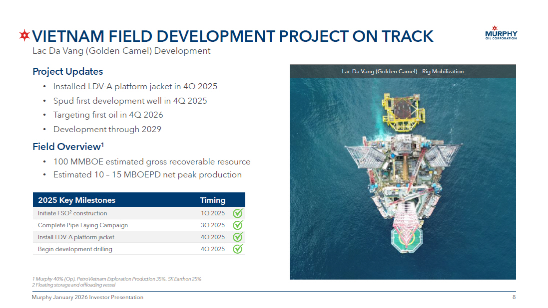 7 7 Murphy January 2026 Investor Presentation 3Q OPERATIONS HIGHLIGHTS 68 MBOEPD TOTAL OFFSHORE PRODUCTION 82% OIL 6% NGL 12% GAS 132 MBOEPD TOTAL ONSHORE PRODUCTION 29% OIL 6% NGL 65% GAS at key operated facilities (King’s Quay, Delta House, and Pioneer) 9 9%+ UPTIME From our Eagle Ford Shale, Tupper Montney, and Kaybob Duvernay assets From our Gulf of America and offshore Canada assets in completion cost per lateral foot in YTD 2025 compared to 2024 9 % REDUCTION of full plant capacity achieved at Tupper West 5 MONTHS PERFORMANCE Three wells online in 3Q were all - time top wells drilled in Dimmit County history 1 RECORD realized natural gas price compared to AECO given sales diversification and fixed price sales 3Q oil production above guidance normalized for no storm downtime 56 MBOPD Advanced high - impact development well expected online in 2H 2026 CHINOOK completed with Khaleesi #2 and Marmalard #3 online 2025 WORKOVERS Eagle Ford Shale Onshore Canada Onshore Offshore Note: Production volumes exclude noncontrolling interest 1 Comparing three - month cumulative oil per 1,000 feet 94 % HIGHER #8 WELL