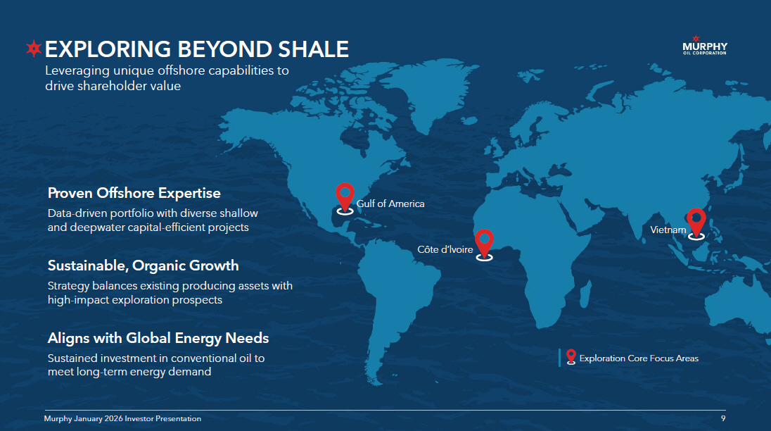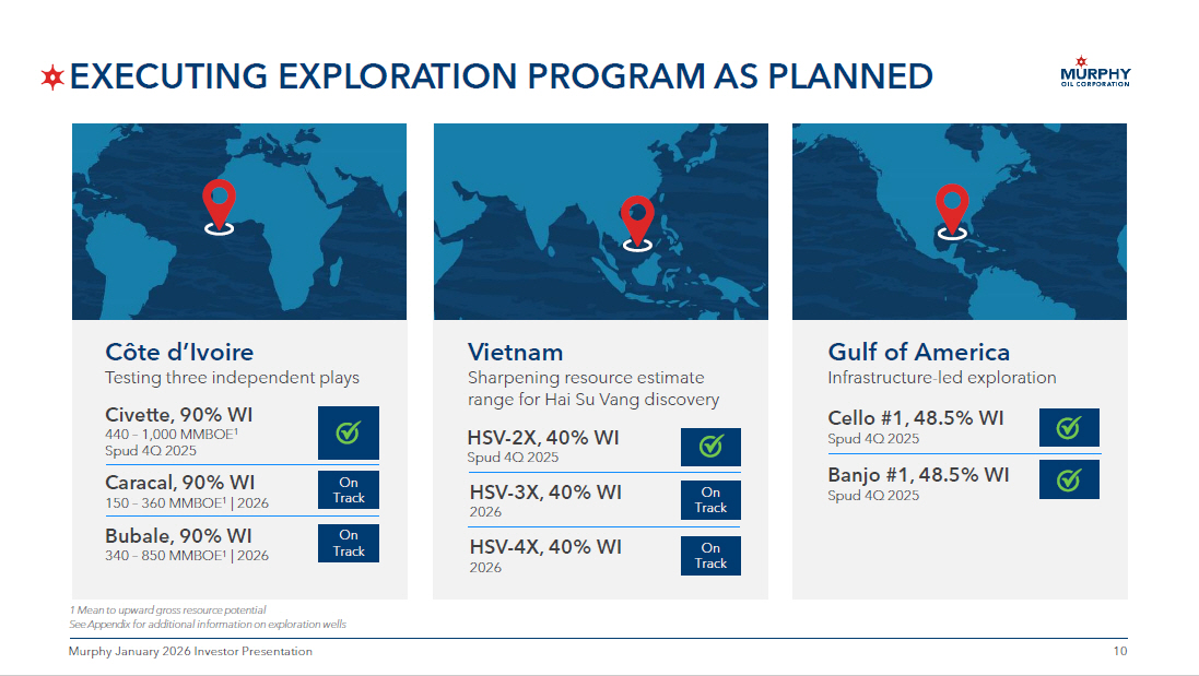 9 9 Murphy January 2026 Investor Presentation Proven Offshore Expertise Data - driven portfolio with diverse shallow and deepwater capital - efficient projects Aligns with Global Energy Needs Sustained investment in conventional oil to meet long - term energy demand Sustainable, Organic Growth Strategy balances existing producing assets with high - impact exploration prospects EXPLORING BEYOND SHALE 9 Murphy January 2026 Investor Presentation Leveraging unique offshore capabilities to drive shareholder value Gulf of America Côte d’lvoire Vietnam Exploration Core Focus Areas
