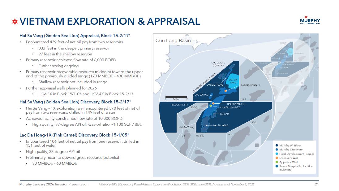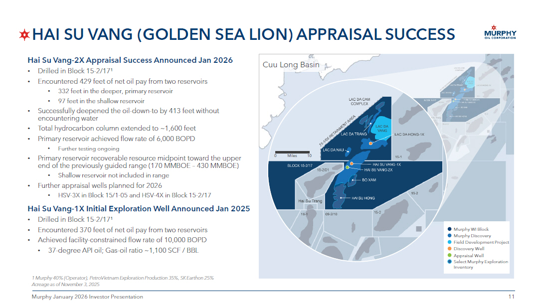HOUSTON, Texas, January 6, 2026 – Murphy Oil Corporation (NYSE: MUR) today announced that its subsidiary has successfully drilled the Hai Su Vang-2X (HSV-2X) appraisal well in Block 15-2/17 in the Cuu Long Basin, located approximately 40 miles offshore of Vietnam. The well spud in early October 2025 and marks a major milestone in Murphy’s strategic appraisal campaign for the Hai Su Vang (Golden Sea Lion) field.