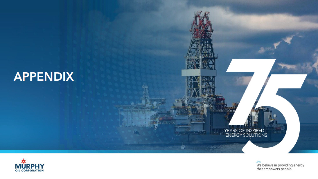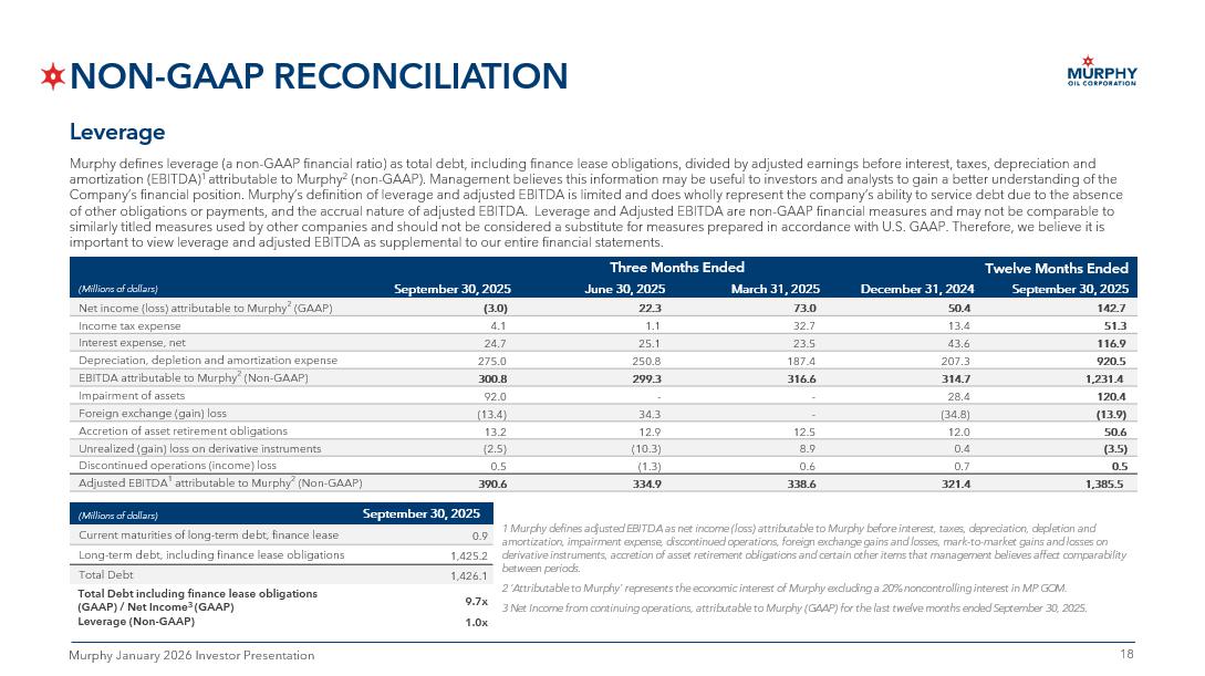 17 17 Murphy January 2026 Investor Presentation NON - GAAP RECONCILIATION Adjusted Free Cash Flow Murphy defines adjusted free cash flow (a non - GAAP financial measure) as net cash provided by continuing operations activities, before non - cash working capital changes, less property additions and dry hole costs, acquisitions of oil and natural gas properties, distributions to NCI, dividends, withh old ing tax on stock - based inventive awards, and other payments such as debt tender and issuance costs and contingent consideration payments. Management believes adjusted free cash flow is important information to provide as it is used by management to evaluate the C omp any’s ability to generate additional cash from business operations. Adjusted free cash flow is a non - GAAP financial measure and should not be considered a substitute for other financial measures as determined in accordance with accounting principles generally accepted in the United States of America (GAAP). Murphy’s definition of adjusted free cash flow is limited and does not represent residual cash flows available for discretion ary expenditures due to the fact that the measure does not deduct the payments required for debt service and other obligations or payments made for business acquisitions. Adjusted fre e cash flow as reported by Murphy may not be comparable to similarly titled measures used by other companies and should be considered in conjunction with other performanc e m easured prepared in accordance with GAAP. Therefore, we believe it is important to view adjusted free cash flow as supplemental to our entire statement of cash flows. Nine Months Ended – Sept 30, 2024 Nine Months Ended – Sept 30, 2025 (Millions of dollars) 1,295.4 998.2 Net Cash provided by continuing operations activities (GAAP) 1 (31.8) 20.5 Exclude: increase (decrease) in non - cash working capital 1,263.6 1,018.7 Operating cash flow excluding working capital adjustments (733.3) (827.0) Less: property additions and dry hole costs 530.3 191.7 Free Cash Flow (Non - GAAP) (136.2) (139.8) Less: cash dividend paid (96.6) (43.2) Less: distributions to noncontrolling interest (25.3) (7.7) Less: withholding tax on stock - based incentive awards - (24.4) Less: acquisition of oil and gas properties 272.2 (23.4) Adjusted Free Cash Flow (Non - GAAP) 1 Includes noncontrolling interest in MP GOM