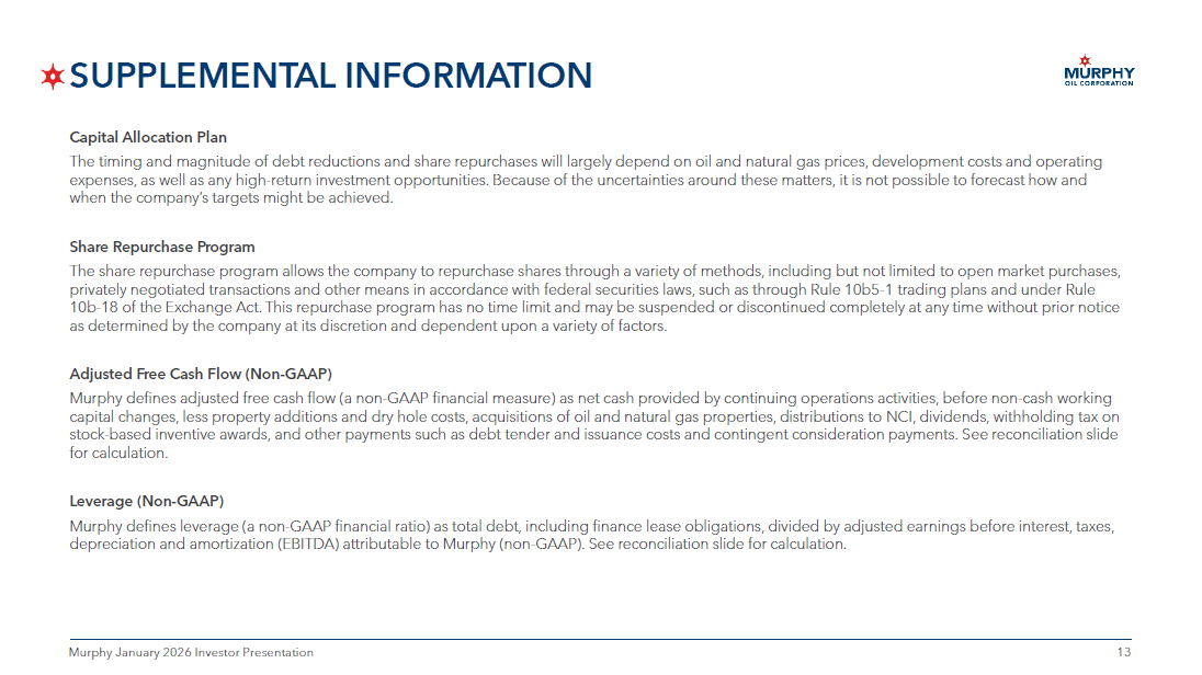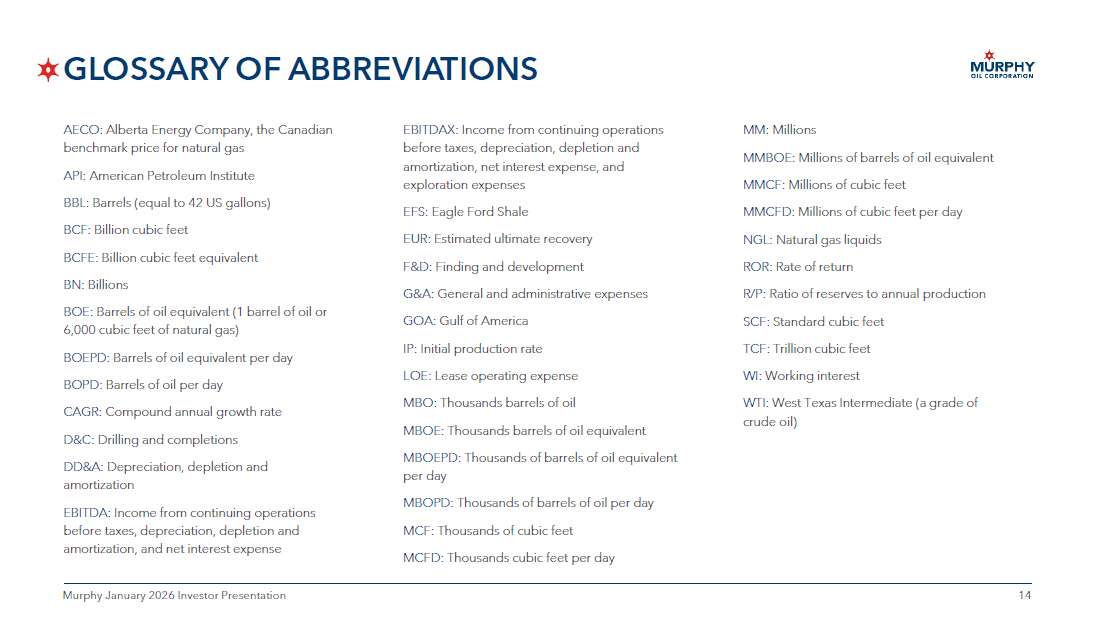 13 13 Murphy January 2026 Investor Presentation SUPPLEMENTAL INFORMATION Capital Allocation Plan The timing and magnitude of debt reductions and share repurchases will largely depend on oil and natural gas prices, developm ent costs and operating expenses, as well as any high - return investment opportunities. Because of the uncertainties around these matters, it is not poss ible to forecast how and when the company’s targets might be achieved. Share Repurchase Program The share repurchase program allows the company to repurchase shares through a variety of methods, including but not limited to open market purchases, privately negotiated transactions and other means in accordance with federal securities laws, such as through Rule 10b5 - 1 tradin g plans and under Rule 10b - 18 of the Exchange Act. This repurchase program has no time limit and may be suspended or discontinued completely at any tim e without prior notice as determined by the company at its discretion and dependent upon a variety of factors. Adjusted Free Cash Flow (Non - GAAP) Murphy defines adjusted free cash flow (a non - GAAP financial measure) as net cash provided by continuing operations activities, before non - cash working capital changes, less property additions and dry hole costs, acquisitions of oil and natural gas properties, distributions to NC I, dividends, withholding tax on stock - based inventive awards, and other payments such as debt tender and issuance costs and contingent consideration payments. S ee reconciliation slide for calculation. Leverage (Non - GAAP) Murphy defines leverage (a non - GAAP financial ratio) as total debt, including finance lease obligations, divided by adjusted ear nings before interest, taxes, depreciation and amortization (EBITDA) attributable to Murphy (non - GAAP). See reconciliation slide for calculation.