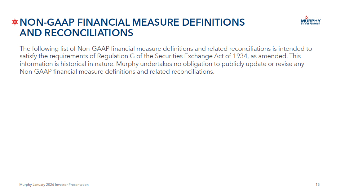 15 15 Murphy January 2026 Investor Presentation NON - GAAP FINANCIAL MEASURE DEFINITIONS AND RECONCILIATIONS The following list of Non - GAAP financial measure definitions and related reconciliations is intended to satisfy the requirements of Regulation G of the Securities Exchange Act of 1934, as amended. This information is historical in nature. Murphy undertakes no obligation to publicly update or revise any Non - GAAP financial measure definitions and related reconciliations.
