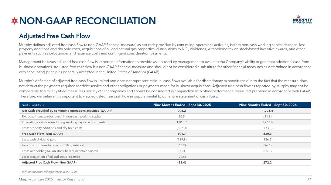 16 16 Murphy January 2026 Investor Presentation NON - GAAP RECONCILIATION Three Months Ended – Sept 30, 2024 Three Months Ended – Sept 30, 2025 (Millions of dollars) 429.0 339.4 Net Cash provided by continuing operations activities (GAAP) 1 (30.7) 28.4 Exclude: increase (decrease) in non - cash working capital 398.3 367.8 Operating cash flow excluding working capital adjustments (216.4) (149.0) Less: property additions and dry hole costs 181.9 218.8 Free Cash Flow (Non - GAAP) (44.7) (46.4) Less: cash dividend paid (35.4) (25.0) Less: distributions to noncontrolling interest - (23.0) Less: acquisition of oil and gas properties 101.8 124.4 Adjusted Free Cash Flow (Non - GAAP) 1 Includes noncontrolling interest in MP GOM Adjusted Free Cash Flow Murphy defines adjusted free cash flow (a non - GAAP financial measure) as net cash provided by continuing operations activities, before non - cash working capital changes, less property additions and dry hole costs, acquisitions of oil and natural gas properties, distributions to NCI, dividends, withh old ing tax on stock - based inventive awards, and other payments such as debt tender and issuance costs and contingent consideration payments. Management believes adjusted free cash flow is important information to provide as it is used by management to evaluate the C omp any’s ability to generate additional cash from business operations. Adjusted free cash flow is a non - GAAP financial measure and should not be considered a substitute for other financial measures as determined in accordance with accounting principles generally accepted in the United States of America (GAAP). Murphy’s definition of adjusted free cash flow is limited and does not represent residual cash flows available for discretion ary expenditures due to the fact that the measure does not deduct the payments required for debt service and other obligations or payments made for business acquisitions. Adjusted fre e cash flow as reported by Murphy may not be comparable to similarly titled measures used by other companies and should be considered in conjunction with other performanc e m easured prepared in accordance with GAAP. Therefore, we believe it is important to view adjusted free cash flow as supplemental to our entire statement of cash flows.