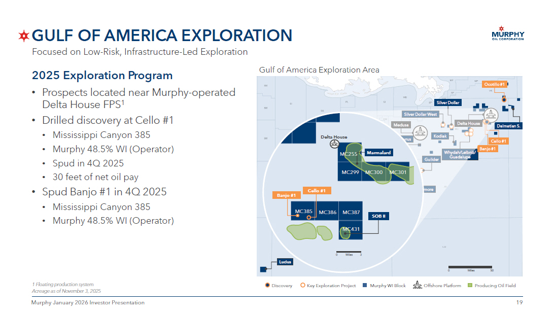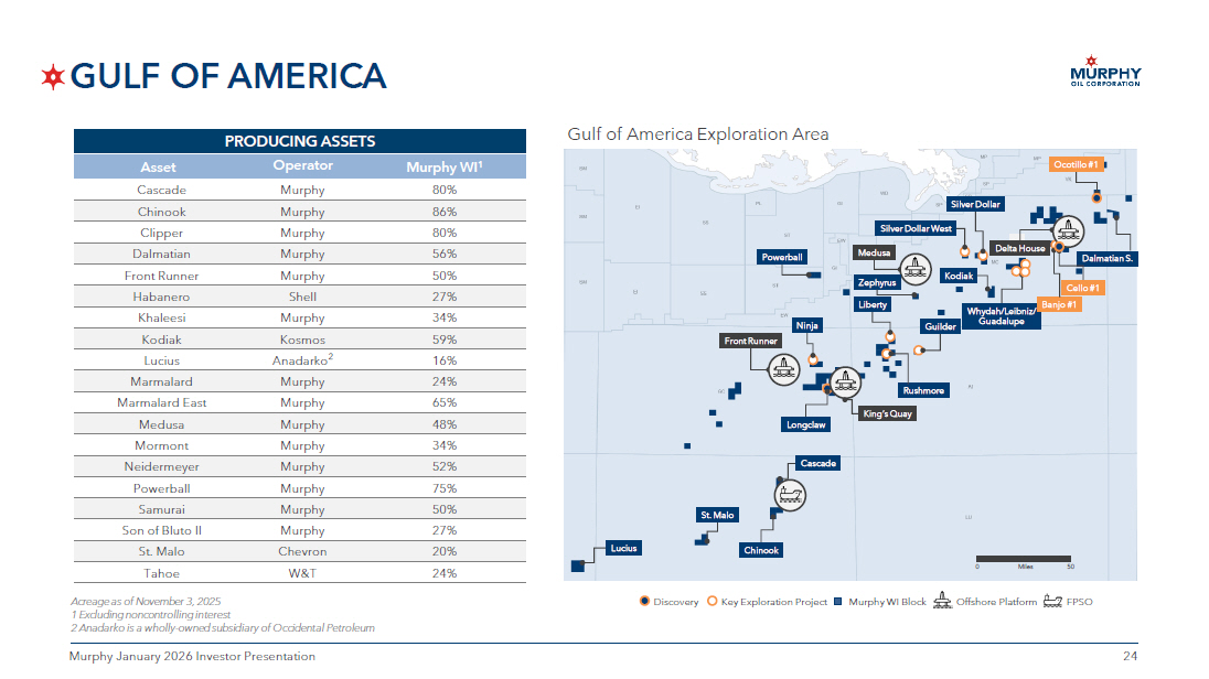 24 24 Murphy January 2026 Investor Presentation GULF OF AMERICA Acreage as of November 3 , 2025 1 Excluding noncontrolling interest 2 Anadarko is a wholly - owned subsidiary of Occidental Petroleum PRODUCING ASSETS Murphy WI 1 Operator Asset 80% Murphy Cascade 86% Murphy Chinook 80% Murphy Clipper 56% Murphy Dalmatian 50% Murphy Front Runner 27% Shell Habanero 34% Murphy Khaleesi 59% Kosmos Kodiak 16% Anadarko 2 Lucius 24% Murphy Marmalard 65% Murphy Marmalard East 48% Murphy Medusa 34% Murphy Mormont 52% Murphy Neidermeyer 75% Murphy Powerball 50% Murphy Samurai 27% Murphy Son of Bluto II 20% Chevron St. Malo 24% W&T Tahoe Gulf of America Exploration Area Offshore Platform FPSO Murphy WI Block Discovery Key Exploration Project Miles 50 0 Kodiak Front Runner Medusa Guilder Silver Dollar West Silver Dollar Liberty Longclaw Powerball Ninja Cascade Chinook Lucius St. Malo Whydah/Leibniz/ Guadalupe Delta House Rushmore King’s Quay Ocotillo #1 Dalmatian S. Zephyrus Banjo #1 Cello #1