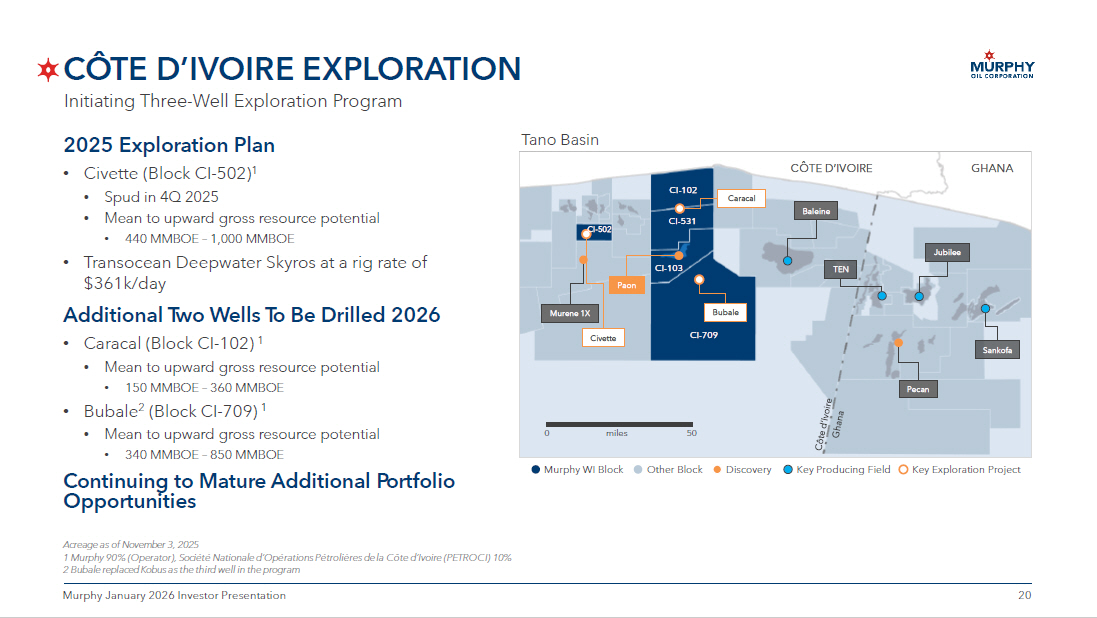 20 20 Murphy January 2026 Investor Presentation CÔTE D’IVOIRE EXPLORATION Tano Basin Murphy WI Block Other Block Discovery Key Producing Field Key Exploration Project Murene 1X CÔTE D’IVOIRE GHANA CI - 102 CI - 531 CI - 103 CI - 709 Baleine Pecan TEN Jubilee Sankofa Paon Civette CI - 502 50 0 miles Caracal Acreage as of November 3, 2025 1 Murphy 90% (Operator), Société Nationale d’Opérations Pétrolières de la Côte d’Ivoire (PETROCI) 10% 2 Bubale replaced Kobus as the third well in the program 2025 Exploration Plan • Civette (Block CI - 502) 1 • Spud in 4Q 2025 • Mean to upward gross resource potential • 440 MMBOE – 1,000 MMBOE • Transocean Deepwater Skyros at a rig rate of $361k/day Additional Two Wells To Be Drilled 2026 • Caracal (Block CI - 102) 1 • Mean to upward gross resource potential • 150 MMBOE – 360 MMBOE • Bubale 2 (Block CI - 709) 1 • Mean to upward gross resource potential • 340 MMBOE – 850 MMBOE Continuing to Mature Additional Portfolio Opportunities Initiating Three - Well Exploration Program Bubale