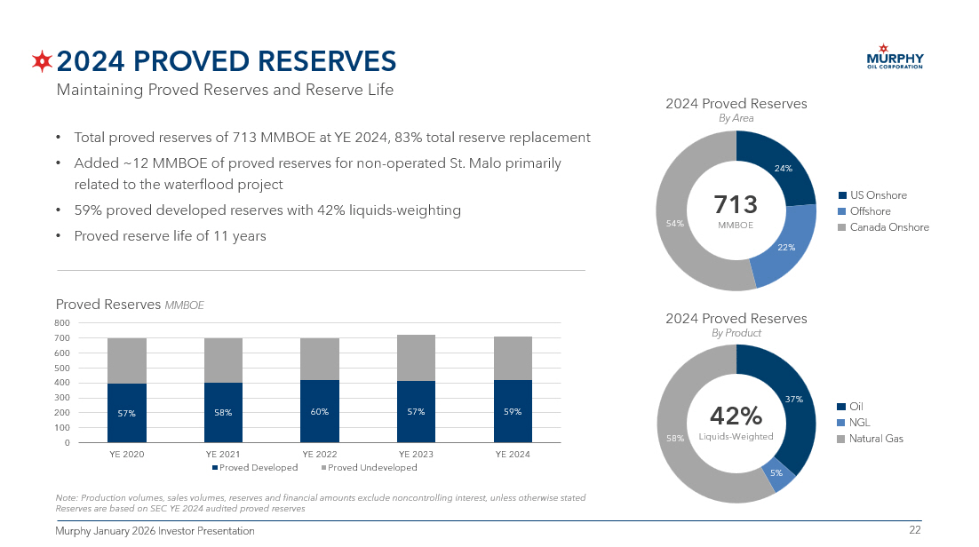 21 21 Murphy January 2026 Investor Presentation VIETNAM EXPLORATION & APPRAISAL 1 Murphy 40% (Operator), PetroVietnam Exploration Production 35%, SK Earthon 25%. Acreage as of November 3, 2025 Hai Su Vang (Golden Sea Lion) Appraisal, Block 15 - 2/17 1 • Encountered 429 feet of net oil pay from two reservoirs • 332 feet in the deeper, primary reservoir • 97 feet in the shallow reservoir • Primary reservoir achieved flow rate of 6,000 BOPD • Further testing ongoing • Primary reservoir recoverable resource midpoint toward the upper end of the previously guided range (170 MMBOE – 430 MMBOE) • Shallow reservoir not included in range • Further appraisal wells planned for 2026 • HSV - 3X in Block 15/1 - 05 and HSV - 4X in Block 15 - 2/17 Hai Su Vang (Golden Sea Lion) Discovery, Block 15 - 2/17 1 • Hai Su Vang – 1X exploration well encountered 370 feet of net oil pay from two reservoirs, drilled in 149 feet of water • Achieved facility - constrained flow rate of 10,000 BOPD • High quality, 37 - degree API oil; Gas - oil ratio ~1,100 SCF / BBL Lac Da Hong - 1X (Pink Camel) Discovery, Block 15 - 1/05 1 • Encountered 106 feet of net oil pay from one reservoir, drilled in 151 feet of water • High quality, 38 - degree API oil • Preliminary mean to upward gross resource potential • 30 MMBOE – 60 MMBOE Cuu Long Basin Discovery Well Appraisal Well Field Development Project Murphy Discovery Murphy WI Block Select Murphy Exploration Inventory Miles 10 0