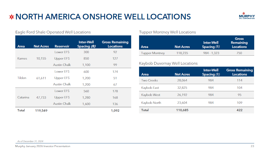 23 23 Murphy January 2026 Investor Presentation NORTH AMERICA ONSHORE WELL LOCATIONS Gross Remaining Locations Inter - Well Spacing (ft) Reservoir Net Acres Area 92 300 Lower EFS 10,155 Karnes 127 850 Upper EFS 99 1,100 Austin Chalk 174 600 Lower EFS 61,611 Tilden 51 1,200 Upper EFS 67 1,200 Austin Chalk 178 560 Lower EFS 47,733 Catarina 168 1,280 Upper EFS 136 1,600 Austin Chalk 1,092 119,549 Total Gross Remaining Locations Inter - Well Spacing (ft) Net Acres Area 114 984 28,064 Two Creeks 104 984 32,825 Kaybob East 95 984 26,192 Kaybob West 109 984 23,604 Kaybob North 422 110,685 Total Kaybob Duvernay Well Locations Eagle Ford Shale Operated Well Locations As of December 31, 2024 Gross Remaining Locations Inter - Well Spacing (ft) Net Acres Area 750 984 - 1,323 118,235 Tupper Montney Tupper Montney Well Locations